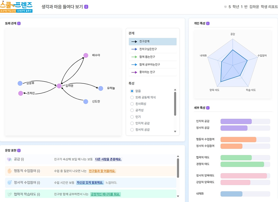 특정 학생을 클릭하면, 그 학생이 맺고 있는 관계와 친구들의 주요 특성까지 함께 확인할 수 있습니다.